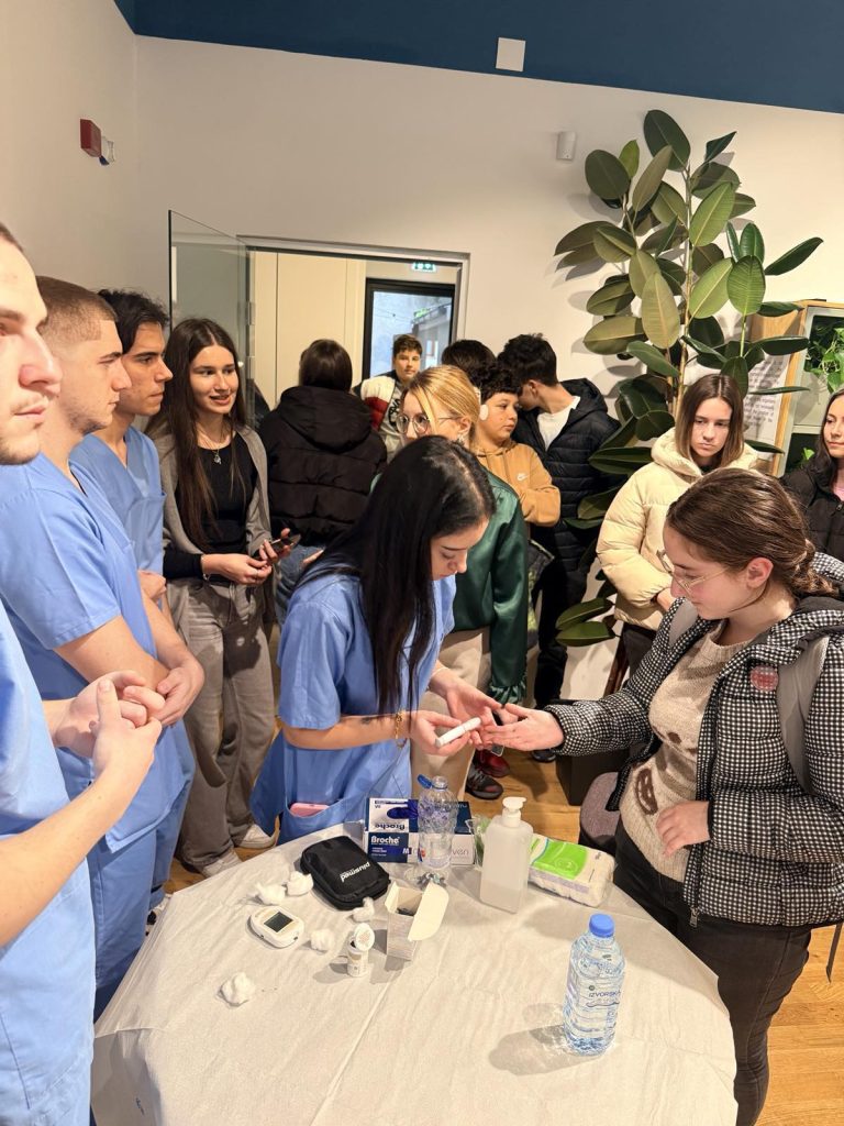 Во рамките на настанот, нашите ученици од образовниот профил медицинска сестра реализираа практична презентација на која демонстрираа правилно мерење на нивото на шеќер во крвта. Со тоа учениците имаа можност активно да се вклучат и да го применат своето знаење, а присутните гости добија корисни информации за значењето на редовната контрола и здравите животни навики.